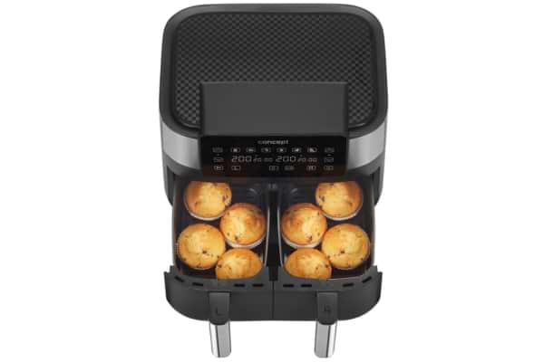 Фритюрниця з функцією гарячого повітря Concept FR8000 — це зручне й корисне рішення для приготування страв з мінімальною кількістю жиру. Дві окремі корзини по 4 літри дозволяють одночасно готувати різні страви, економлячи час і зберігаючи смаки. Завдяки розумним програмам і функції сушіння відкривається безліч кулінарних можливостей — від хрусткої картоплі до корисних RAW-закусок.